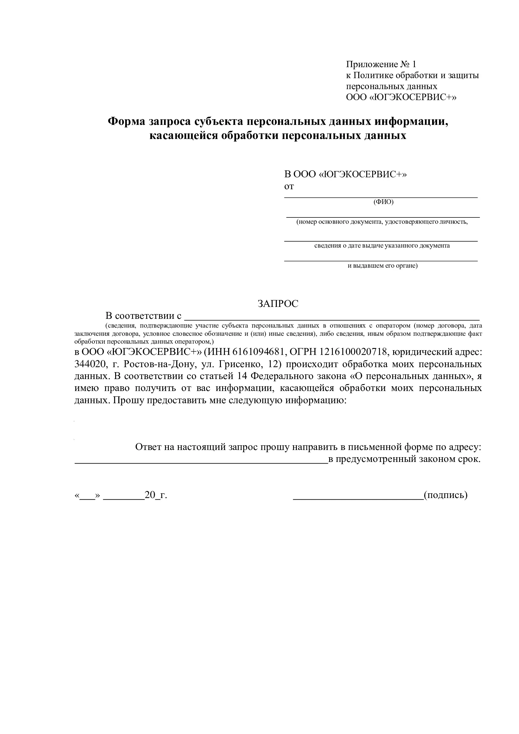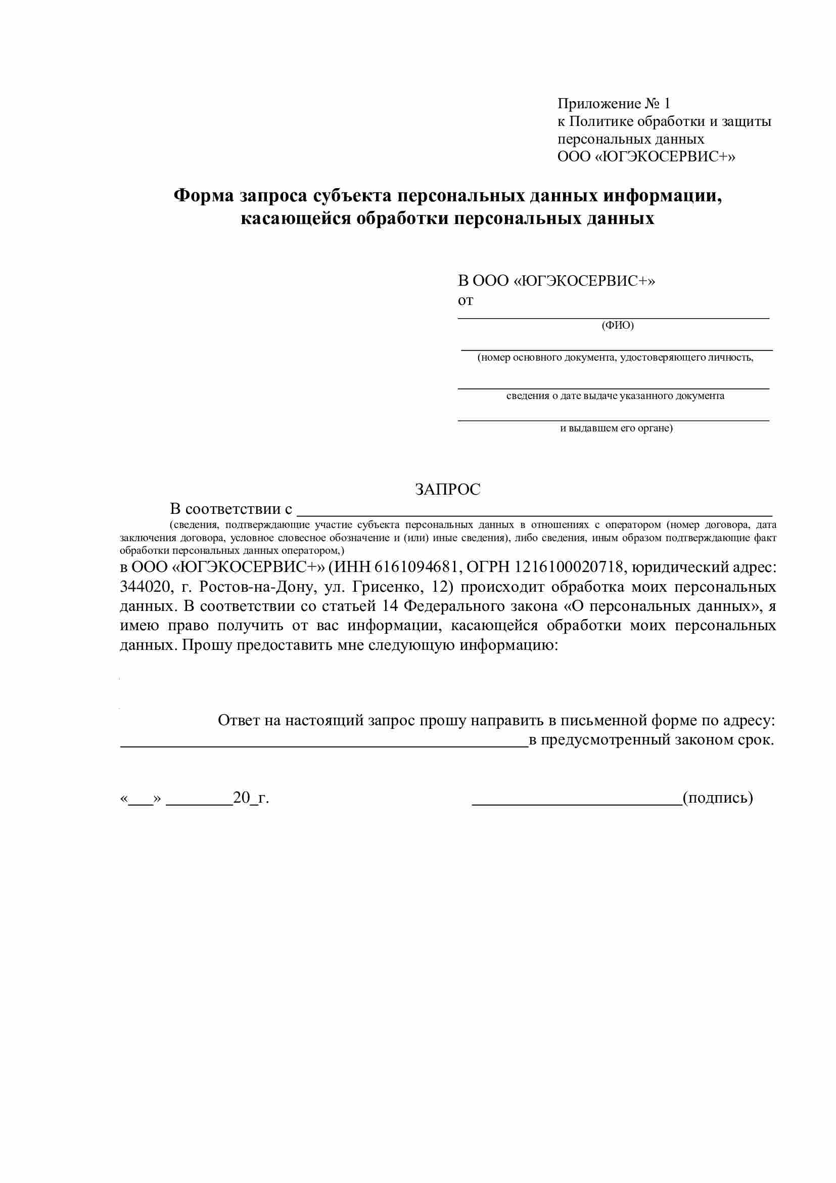 6.8. Для получения необходимой информации, касающейся обработки персональных данных, описанной в пункте 6.5.1. настоящей Политики, Субъекту (либо законному представителю) необходимо заполнить соответствующую форму запроса субъекта персональных данных информации, касающейся обработки персональных данных (приложение 1 или 5) и передать лично работникам ООО «ЮГЭКОСЕРВИС+», принимающим обращения граждан, либо по почте.