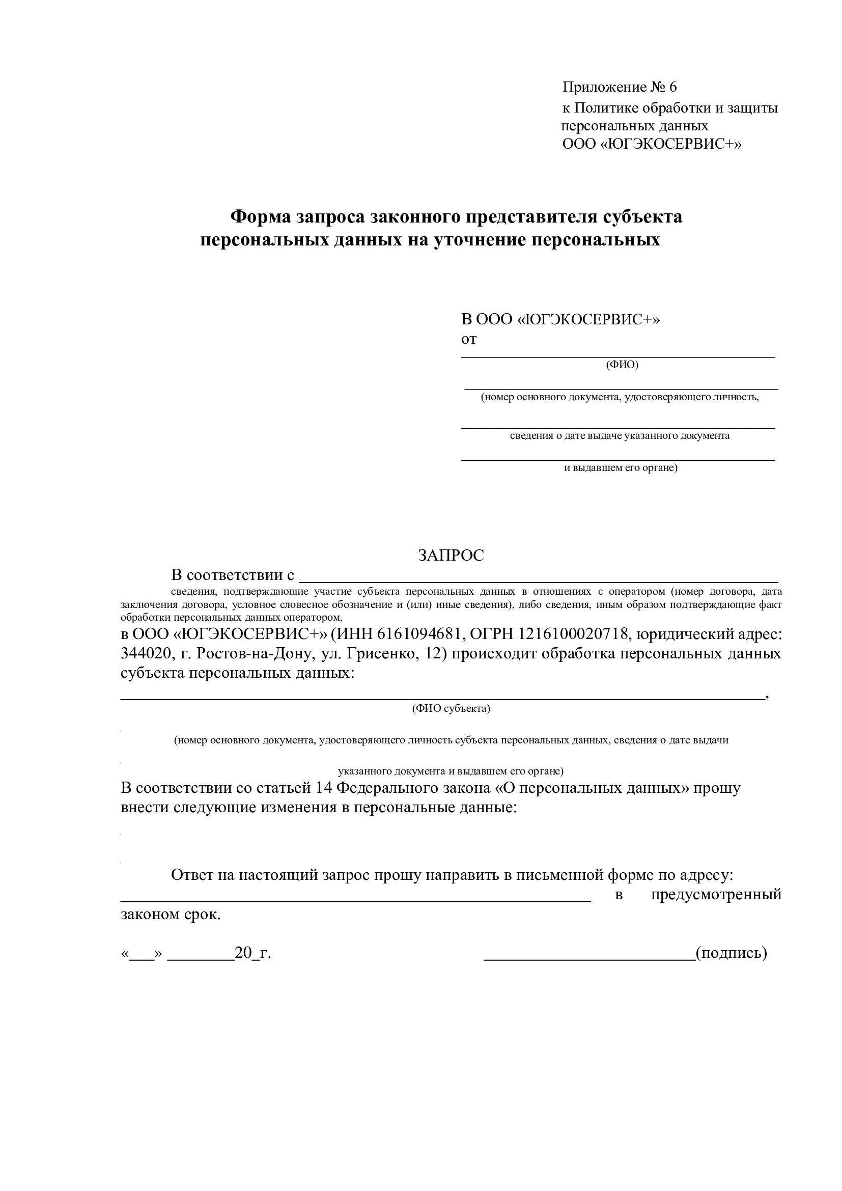 6.9. Для уточнения определенных персональных данных Субъекту (либо законному представителю) необходимо заполнить соответствующую форму запроса субъекта персональных данных на уточнение персональных данных (приложение 2 или 6) и передать лично работникам ООО «ЮГЭКОСЕРВИС+», принимающим обращения граждан, либо по почте.