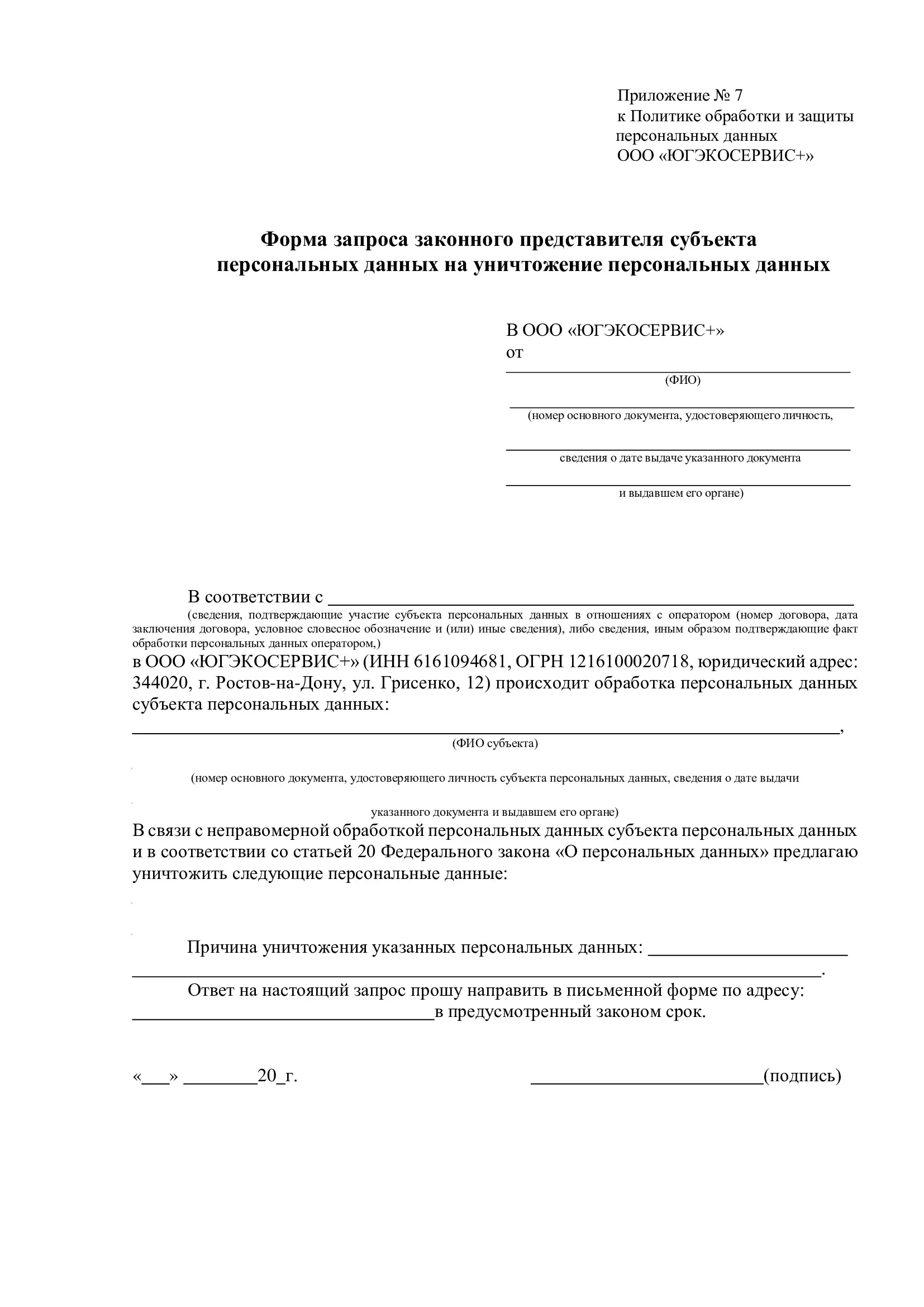 6.10. Для исключения неправомерности обработки персональных данных Субъекту (либо законному представителю) необходимо заполнить соответствующую форму запроса субъекта персональных данных на уничтожение персональных данных (приложение 3 или 7) и передать лично работникам ООО «ЮГЭКОСЕРВИС+», принимающим обращения граждан, либо по почте.